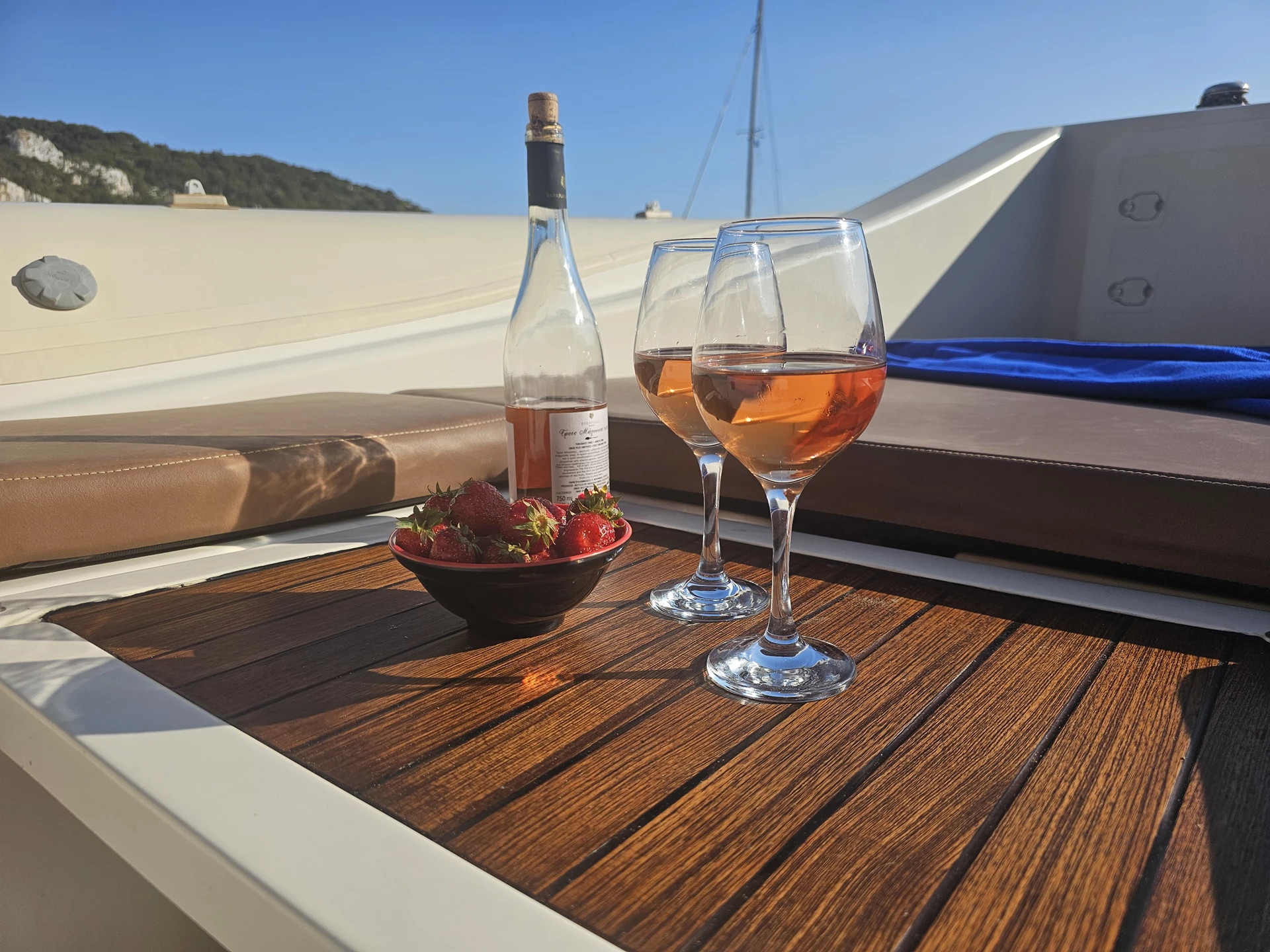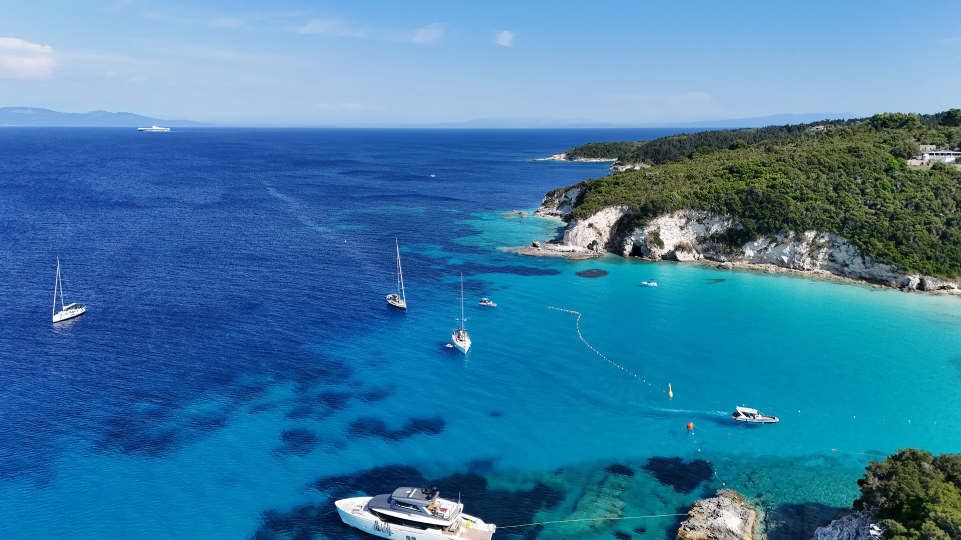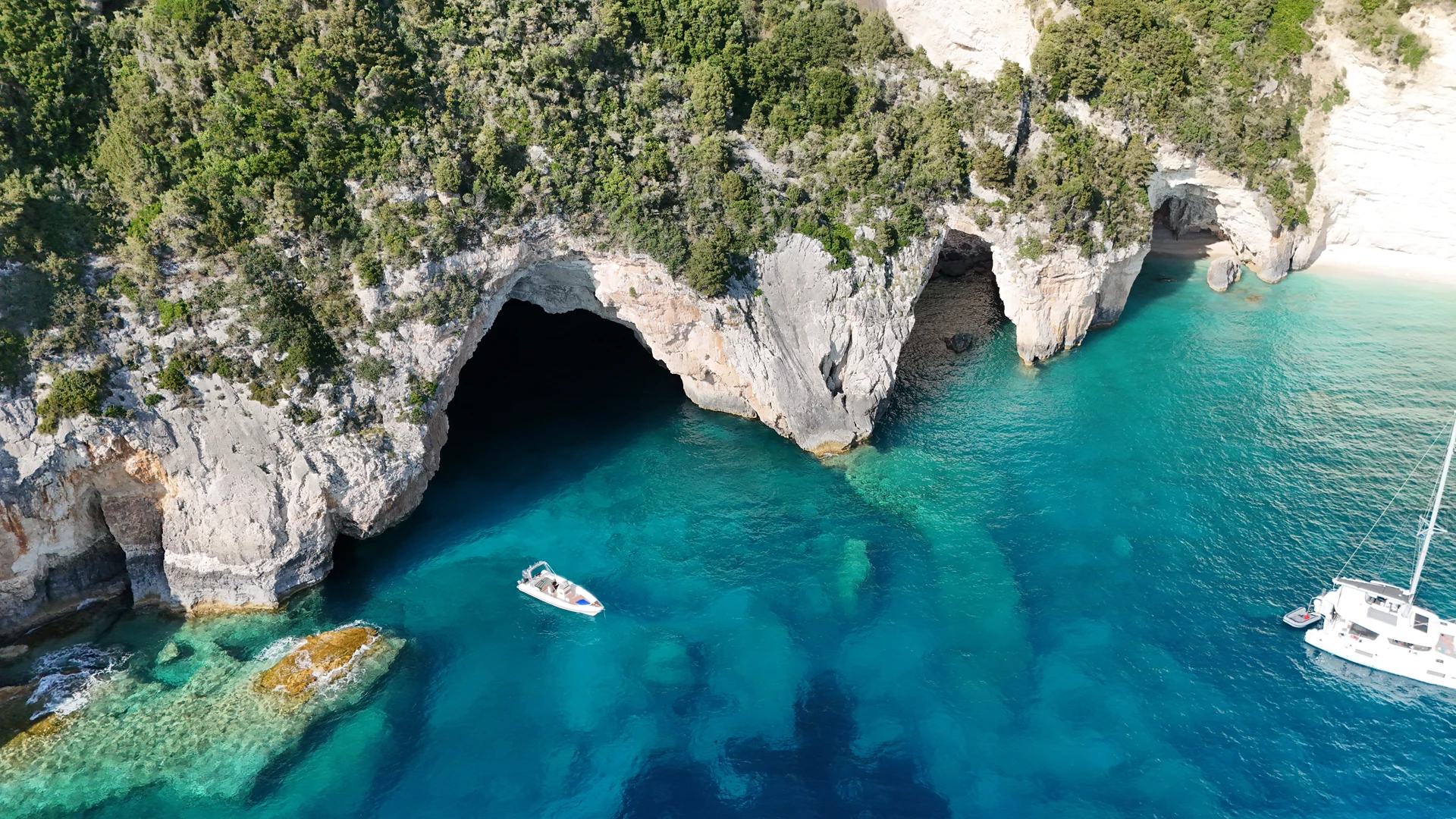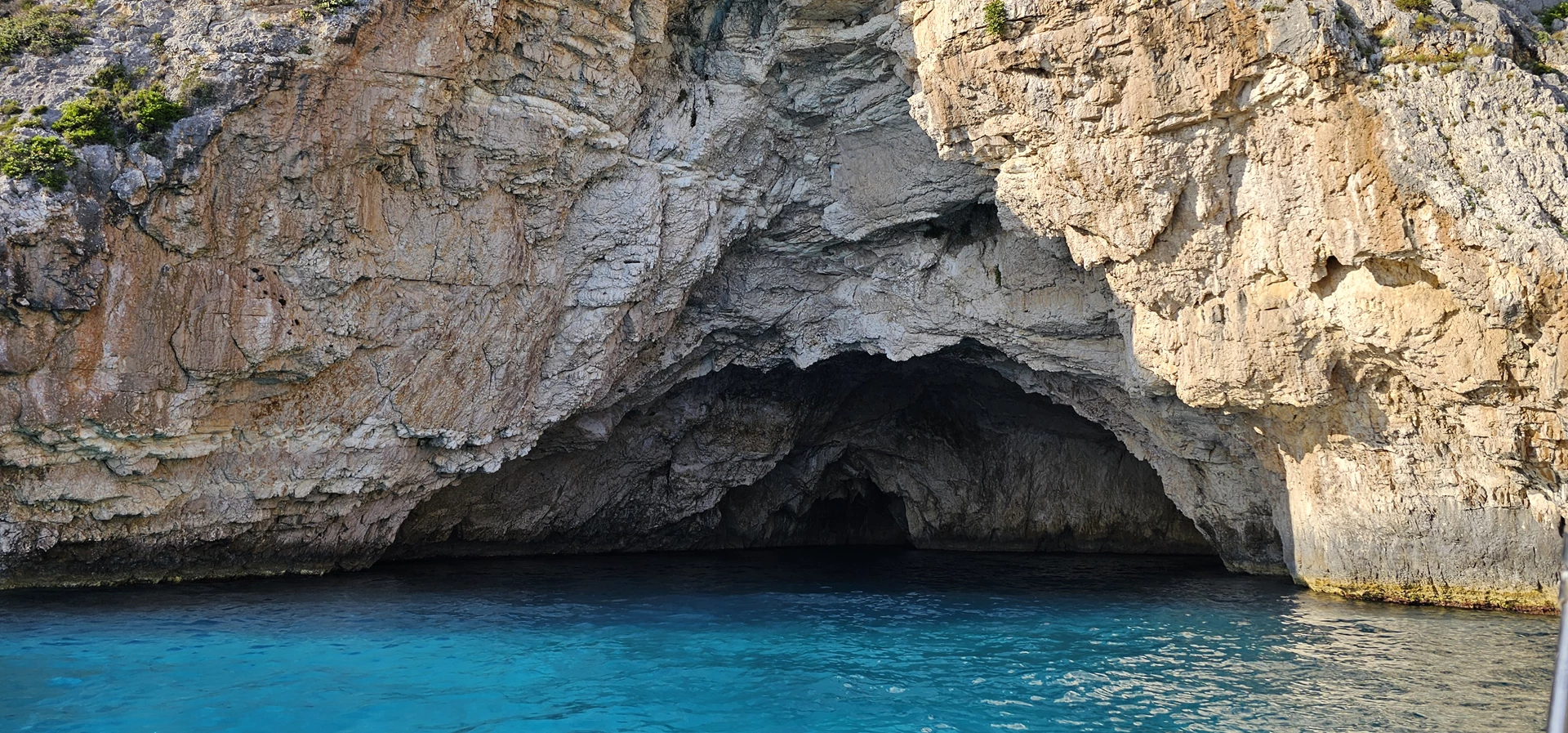 Anker lichten und wir segeln nach Achai. Dort betreten wir die erste der drei außergewöhnlichen Höhlen, die miteinander verbunden sind. Anschließend ankern wir. Sie haben die Möglichkeit, in den verschiedensten Blautönen zu schwimmen und zu schnorcheln. Vergessen Sie nicht, in der zweiten Höhle zu schwimmen und den blauen Himmel zu bewundern – die Decke ist eingestürzt, wodurch ein Loch entstanden ist, das die Höhle auf magische Weise erleuchtet.