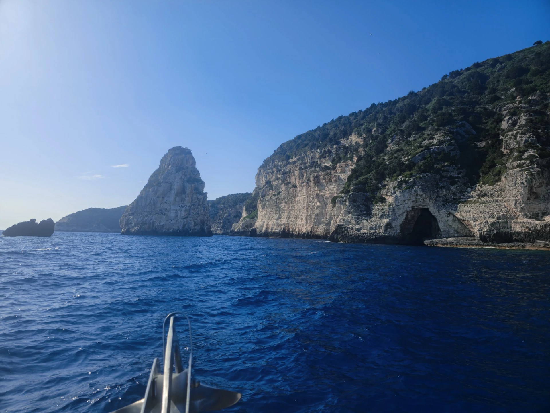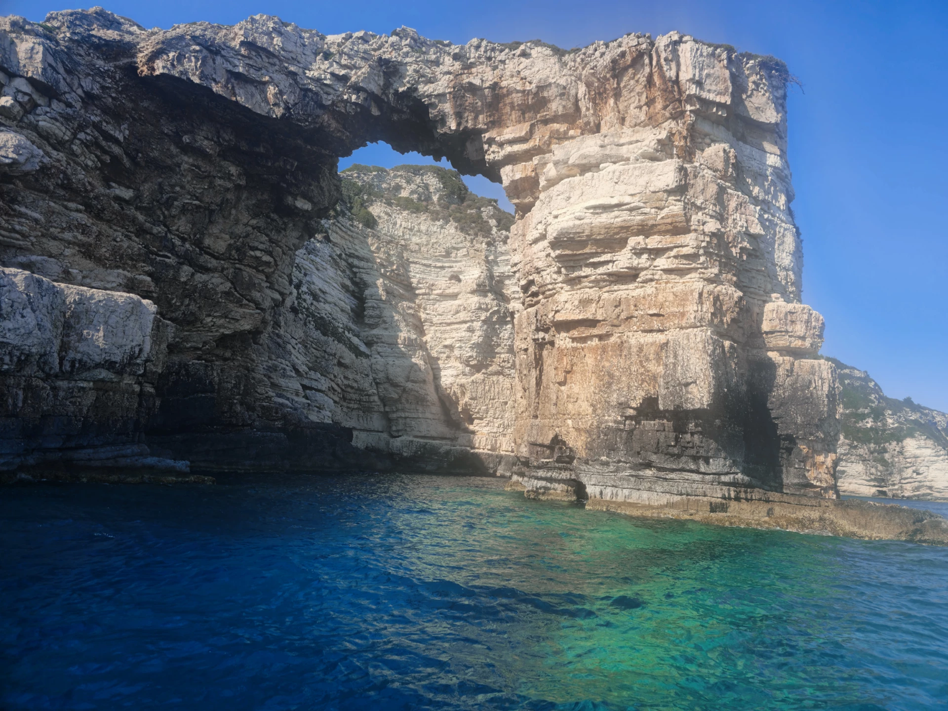 Nach unserem erfrischenden Bad erkunden wir Ortholithos, einen beeindruckenden, im Meer stehenden Felsen. Dies ist die letzte Höhle, die wir betreten, mit wunderschönem Wasser und dem Blick auf einen senkrecht ins kristallklare Meer ragenden Felsen. Anschließend segeln wir zur Bucht von Galazio. Galazio bedeutet hellblau und der Ort verdient seinen Namen! Sie werden nicht glauben, dass es diese Schönheit auf der Welt gibt! Der letzte Ort, den wir westlich von Paxos besuchen, ist der berühmte Tripitos-Bogen oder „Kamara“. Wir werden die enorme und elegante Struktur dieser natürlichen Brücke bewundern, die von blauem und grünem Wasser umgeben ist.