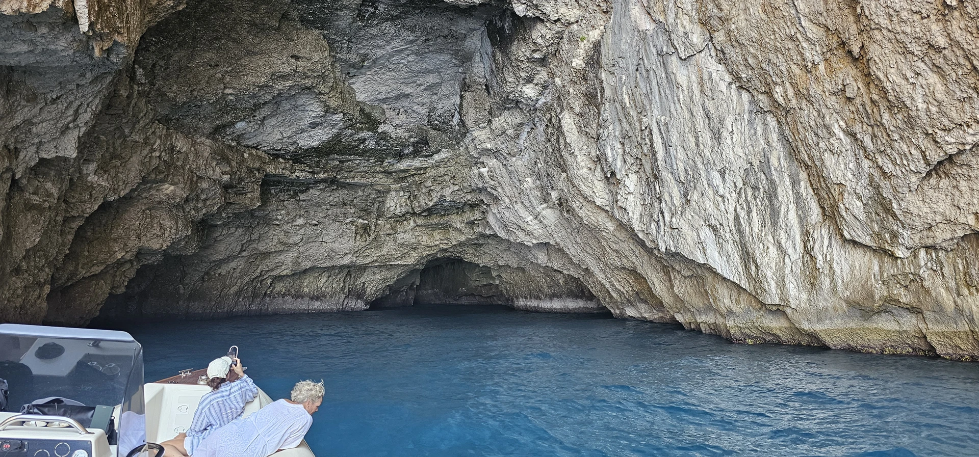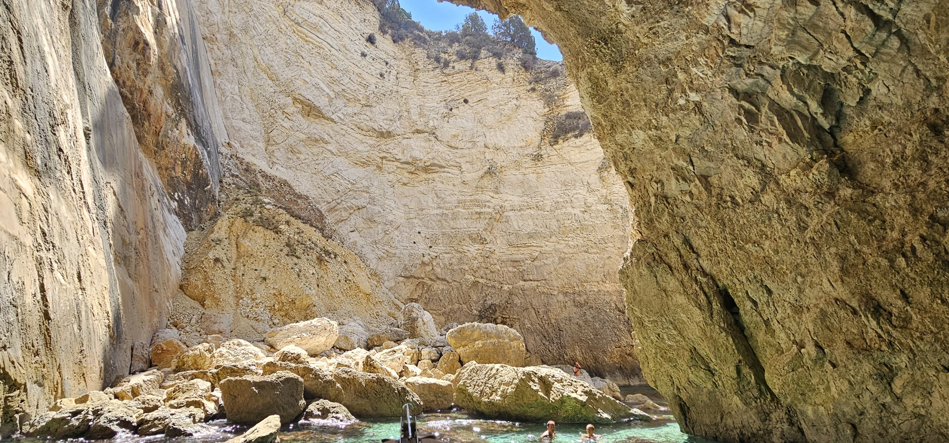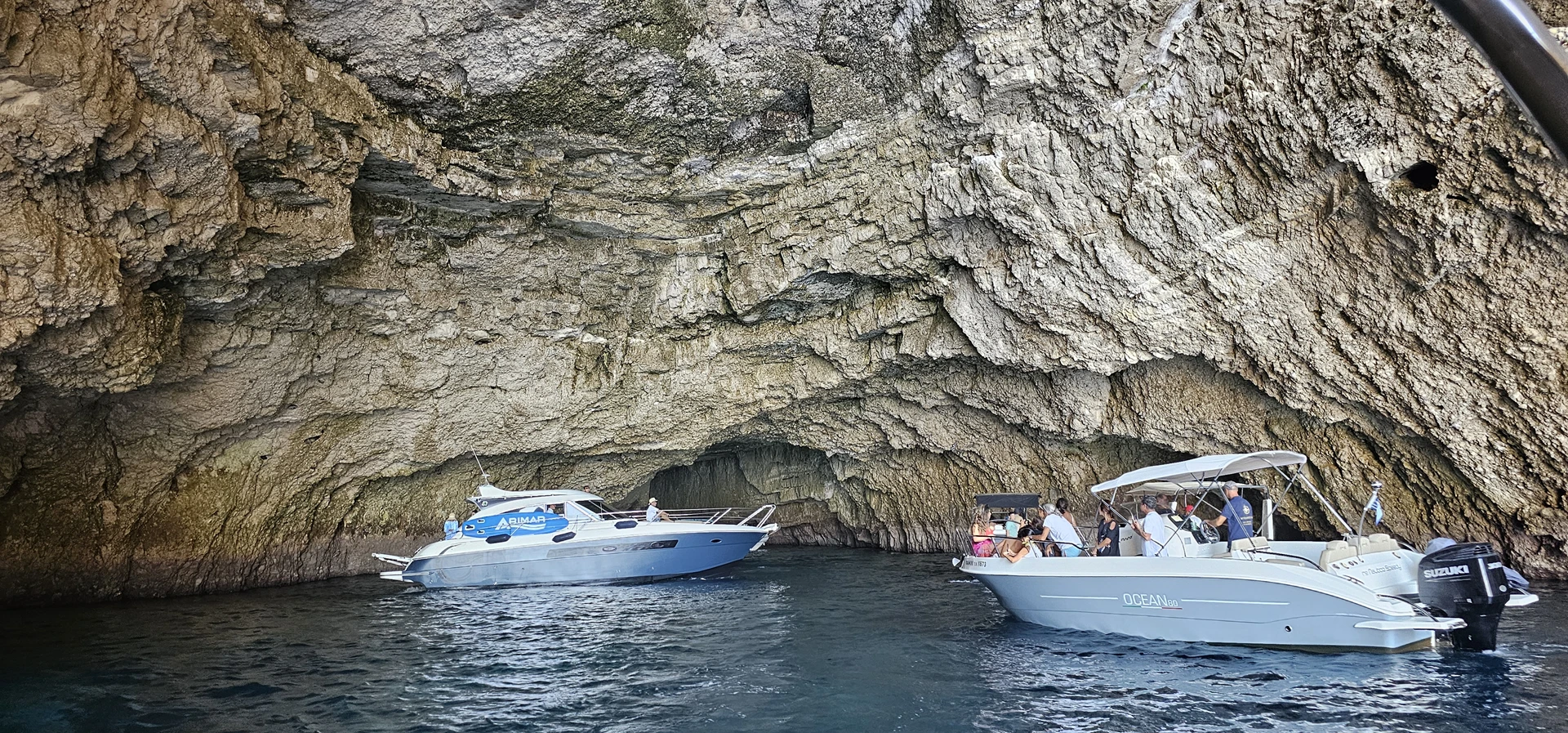 Εκεί θα μπούμε μέσα στην πρώτη από τις τρεις εξαιρετικές σπηλιές που επικοινωνούν μεταξύ τους και μετά θα αγκυροβολήσουμε και θα έχετε την ευκαιρία να κολυμπήσετε και να κολυμπήσετε με αναπνευστήρα σε διάφορες αποχρώσεις του μπλε. Μην ξεχάσετε να κολυμπήσετε στη δεύτερη σπηλιά και να κοιτάξετε τον γαλάζιο ουρανό – η οροφή έχει πέσει και ως αποτέλεσμα, υπάρχει μια τρύπα που φωτίζει τη σπηλιά με έναν μαγικό τρόπο.